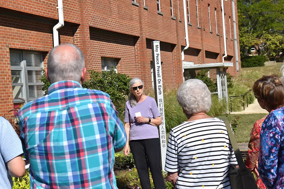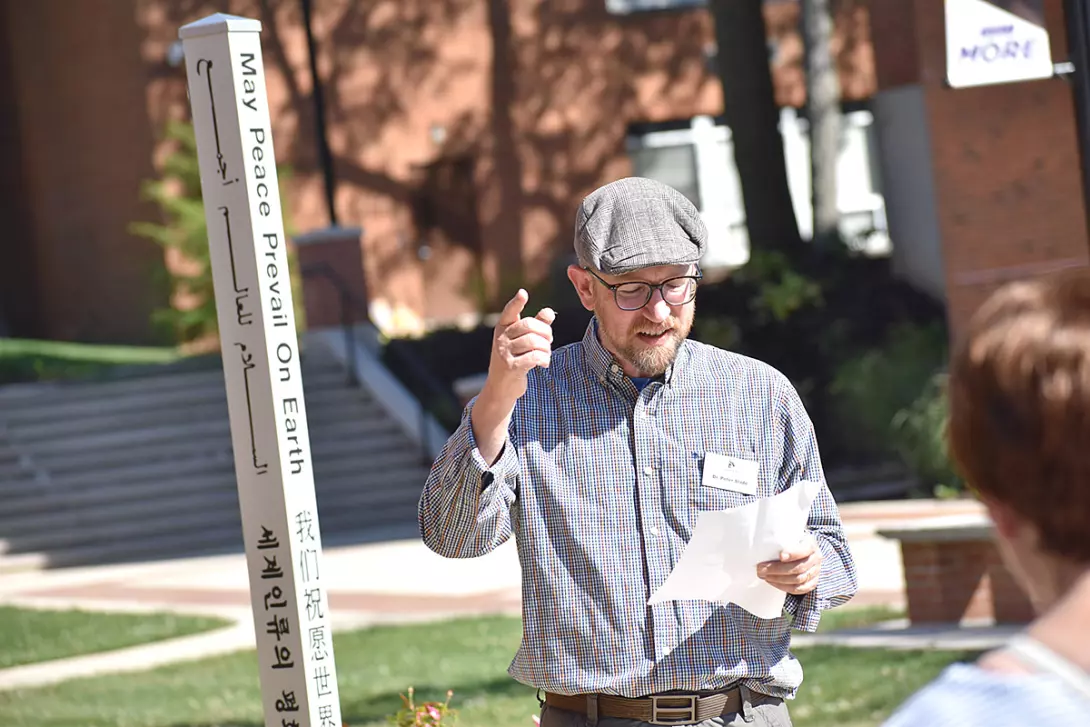 During a dedication ceremony, Peter Slade, Ph.D., professor of religion, explained the purpose of the Peace Pole to the AU community.