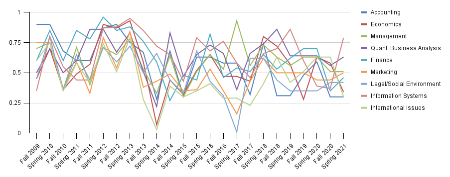 During 2020/2021, the spring 2021 semester outperformed fall 2020. Five of the nine areas showed improvement: Quantitative Business Analysis (63rd percentile), Finance (46th percentile), Marketing (50th percentile), Legal and Social Environment (42nd percentile) and Information Systems (79th percentile). We were pleased to see the improvements made with Information Systems, Legal and Social Environment and Marketing outcomes, in comparison to 2019-2020. However, Finance, Legal and Social Environment, Accounting, Economics and International Issues are areas of concern. Overall, students scored at the 46th percentile in both fall 2020 and spring 2021.