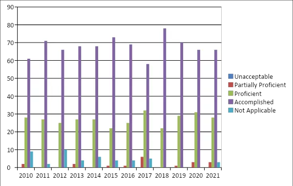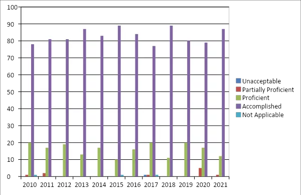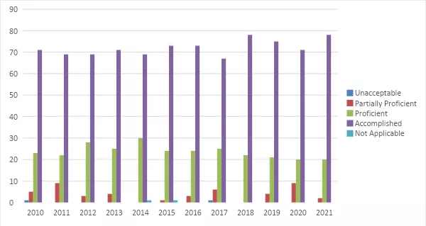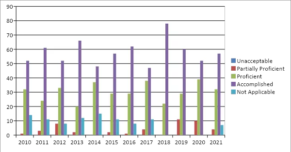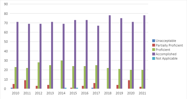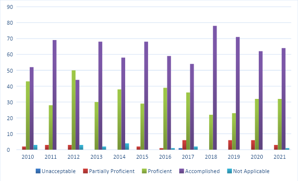 The employer survey is administered via an online survey. The employer survey is completed by the student’s internship supervisor (employer), enabling the supervisor to evaluate the intern’s performance in five of the seven student learning outcome content areas, including communication skills, leadership and teamwork, business knowledge and technical skills, ethics and analytical and quantitative skills. Results for the last eleven years 2010-2021 are provided in the following five figures. In general, we are very pleased with the strong performance displayed by our students during their internships. This reinforces the anecdotal evidence received informally from our internship employers, who have been very complimentary about our students’ preparation, ability and motivation.