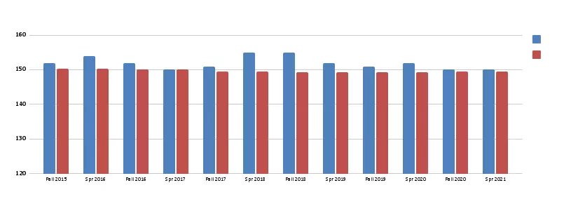 Although COBE performance was above the national average for the three semesters between fall 2015 and fall 2016, it fell below the national average for the spring 2017 group. From fall 2017 to spring 2020, we have remained at or above the national average. During the fall 2020 and spring 2021 semesters, although our scores were consistent, they were below the national average. While our international student population has declined within the most recent four years, we continue to work with both domestic and international student populations to improve learning outcomes and experiences. Overall COBE performance has been consistent at or above the 50th percentile fifteen of the last twenty semesters. Though we can’t say for sure, performance also may have declined because of the disruptions and distractions caused by COVID-19.