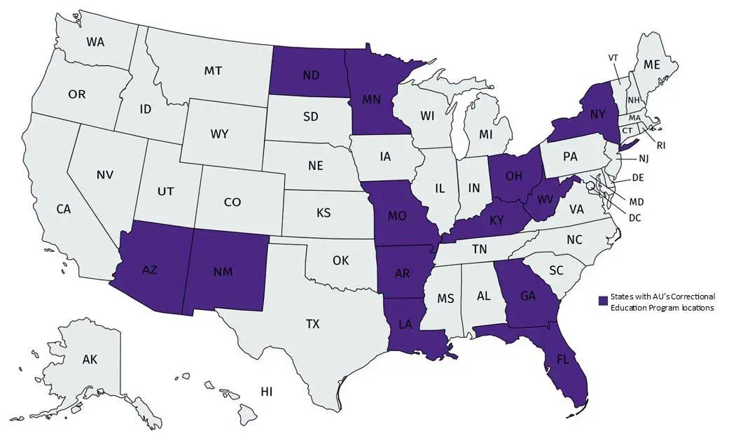 The below map shows the states where Ashland University's Correctional Education Program is operating inside facilities.