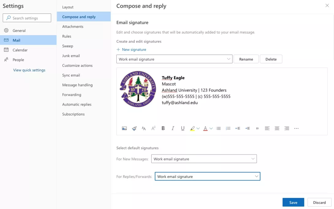 To add this signature in Outlook, click the "gear" icon in the top-right to view the settings, then click "View all Outlook settings". Select "Compose and Reply" to open the signature settings. Give the signature a name to identify it (e.g. "Work email signature") and paste the signature into the text area either with the keyboard shortcut (CTRL+V on Windows or CMD+V on Mac) or by right-clicking and selecting "Paste". Click the "Save" button, then select the new signature to be used for new messages and for replies.