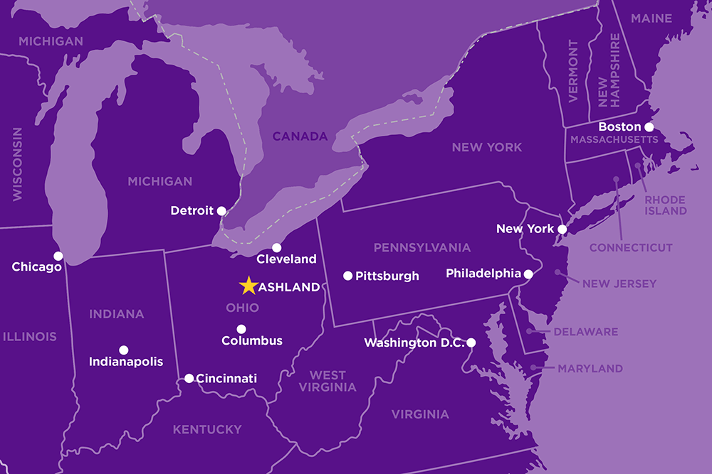 - Ashland is located within an hour of the largest cities in Ohio - Cleveland and Columbus. The campus is also within a day's drive of many of the great cities of the United States.