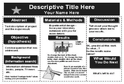 - Posters should display an abstract, data tables, diagrams, charts, photographs and graphs. Project logbooks, research reports, research plans and documentation of research protocols are expected and may be presented in notebooks or folders on the table.