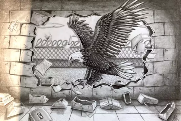 Bennett’s illustration shows an eagle, which he named Esau: The Education Eagle for All, breaking through a brick wall.
