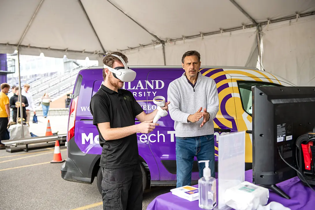 One VR station gave students a “how to” look at installing solar panels, changing oil, performing surgery and more, while another, put on by AU’s Workforce Development program, showcased 5G telecommunications, including what it would be like to climb towers and work with fiber optics.