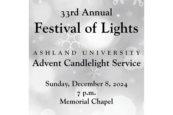 ASHLAND, Ohio – The 33rd edition of Ashland University’s Festival of Lights, a collaboration between the choral music program and the Office of Christian Ministry, will take place Sunday, Dec. 8. The Advent candlelight service starts at 7 p.m., at Jack and Deb Miller Chapel.