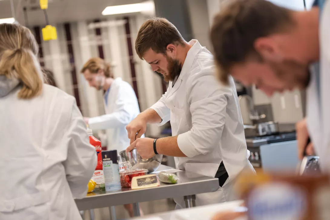 student preparing food in dietetics lab class