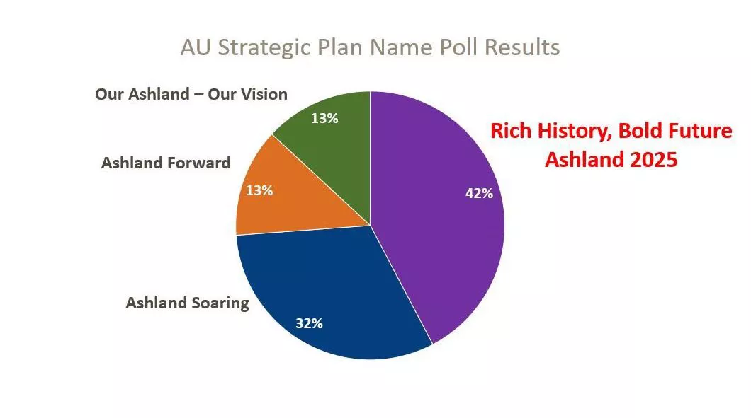 The strategic plan for 2020-2025 is titled Rich History/Bold Future - Ashland 2025. Three themes support our strategic plan: Transformational Experiences, Strategic Growth and Empowered Community.