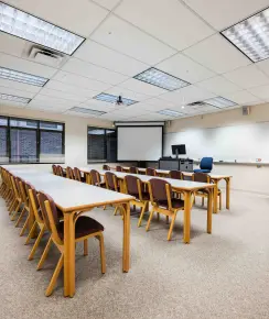 The central quad provides a calm green space connecting several of the seminary’s main buildings. Benches and shaded tables offer spots for conversation, study or rest beneath the trees. Just beyond, the prayer garden offers a more secluded retreat, where winding paths and scripture markers invite solitude and spiritual renewal.